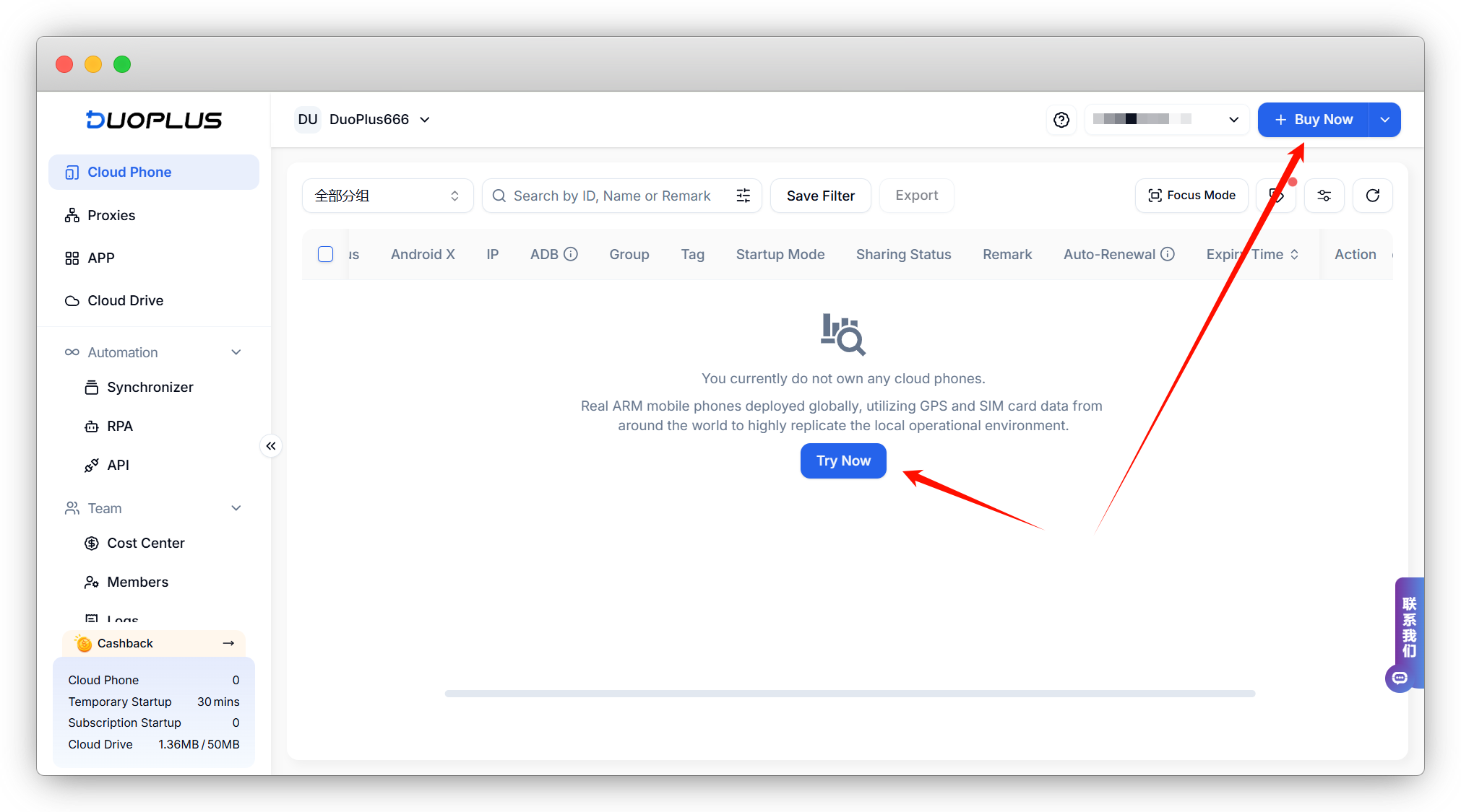 Method 2: Click "Buy Cloud Phone" at the top right corner.
