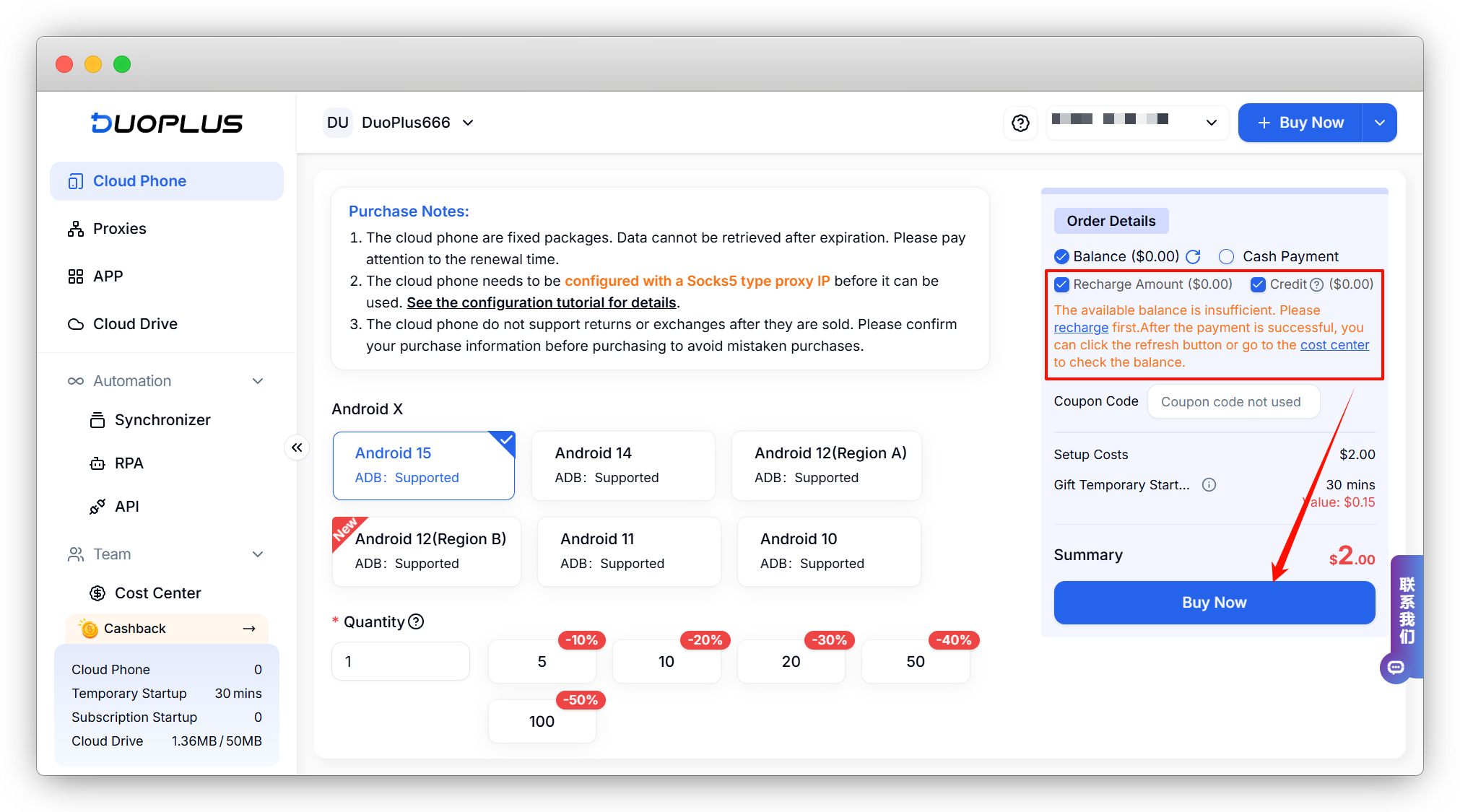 Select the duration for which you want to purchase the cloud phone and the payment method, then click "Buy Now" at the bottom right.
