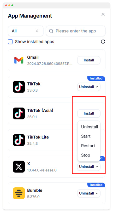 You can manage applications on the right side of the app, including: install, uninstall, start, restart, and stop.
