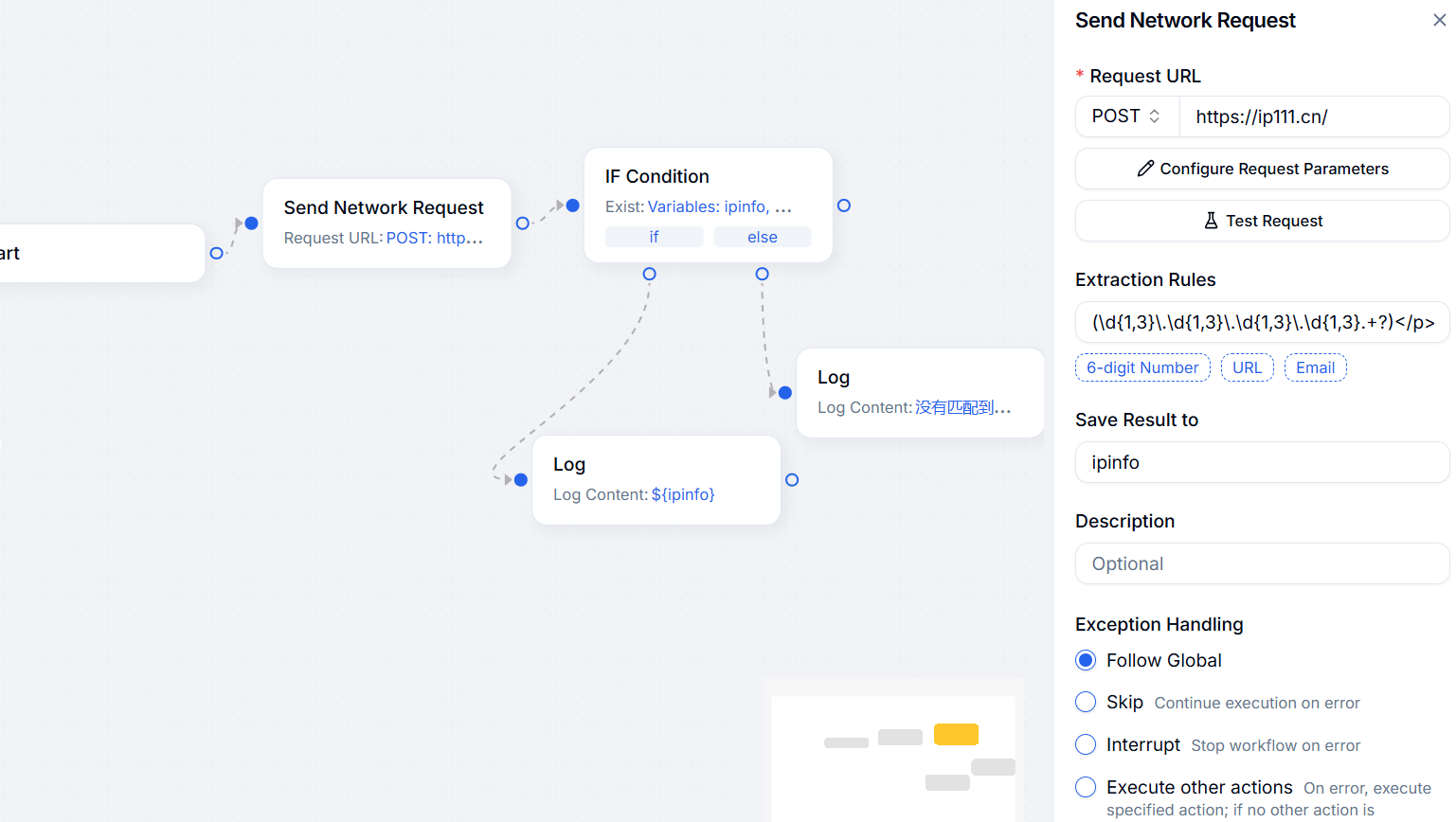 In RPA workflow editing, you may sometimes develop your own web API to provide flexible dynamic parameters, or you might need to fetch specific data via network requests. Below is a simple example of matching content from a network request.