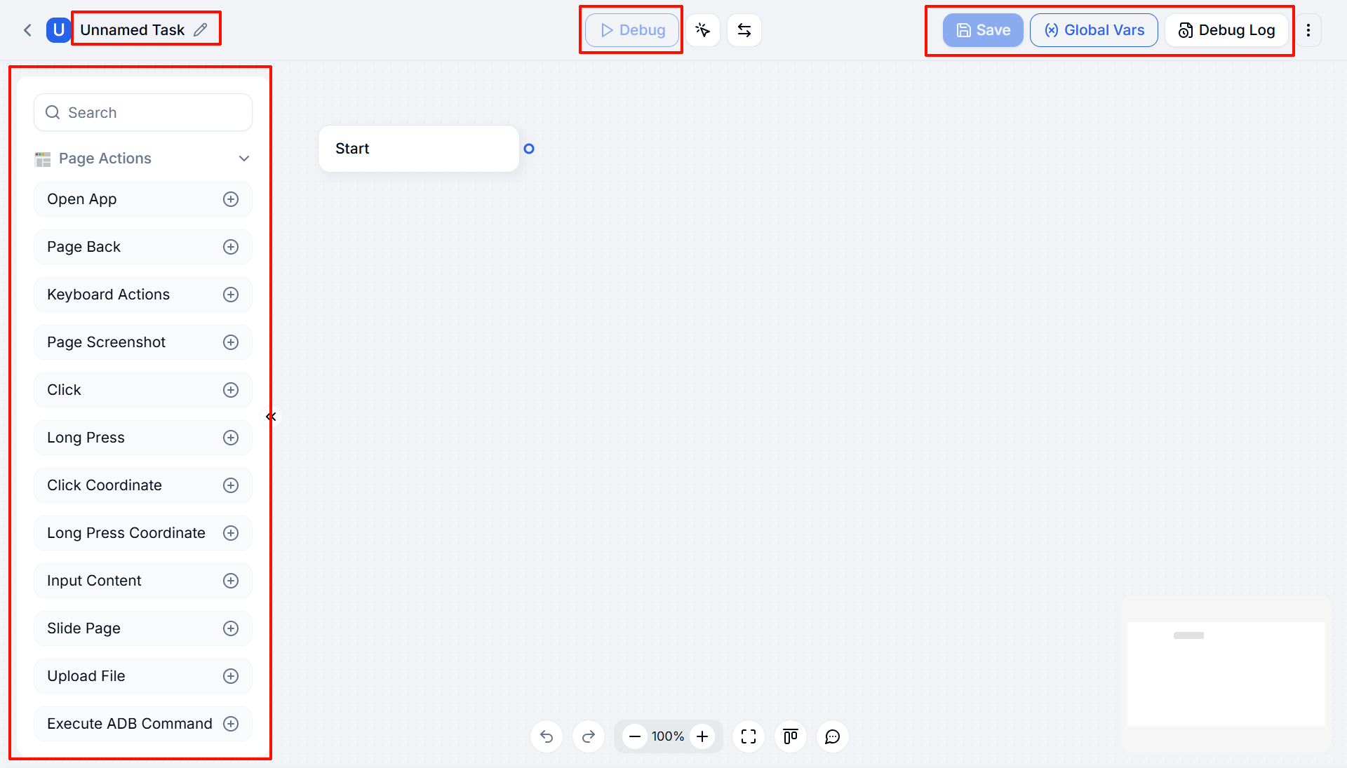 - After completing the workflow, run a debug session to execute the actions on the cloud phone.