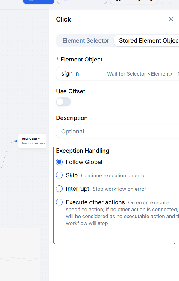 Exception handling allows you to define how failed workflow steps are handled. Most functions support exception handling, as shown below.