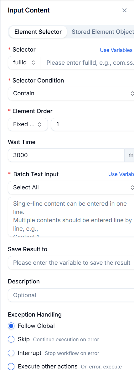 Get the input box by selector type and condition. Variables can be used as input content, and the input content can also be saved as a new variable.