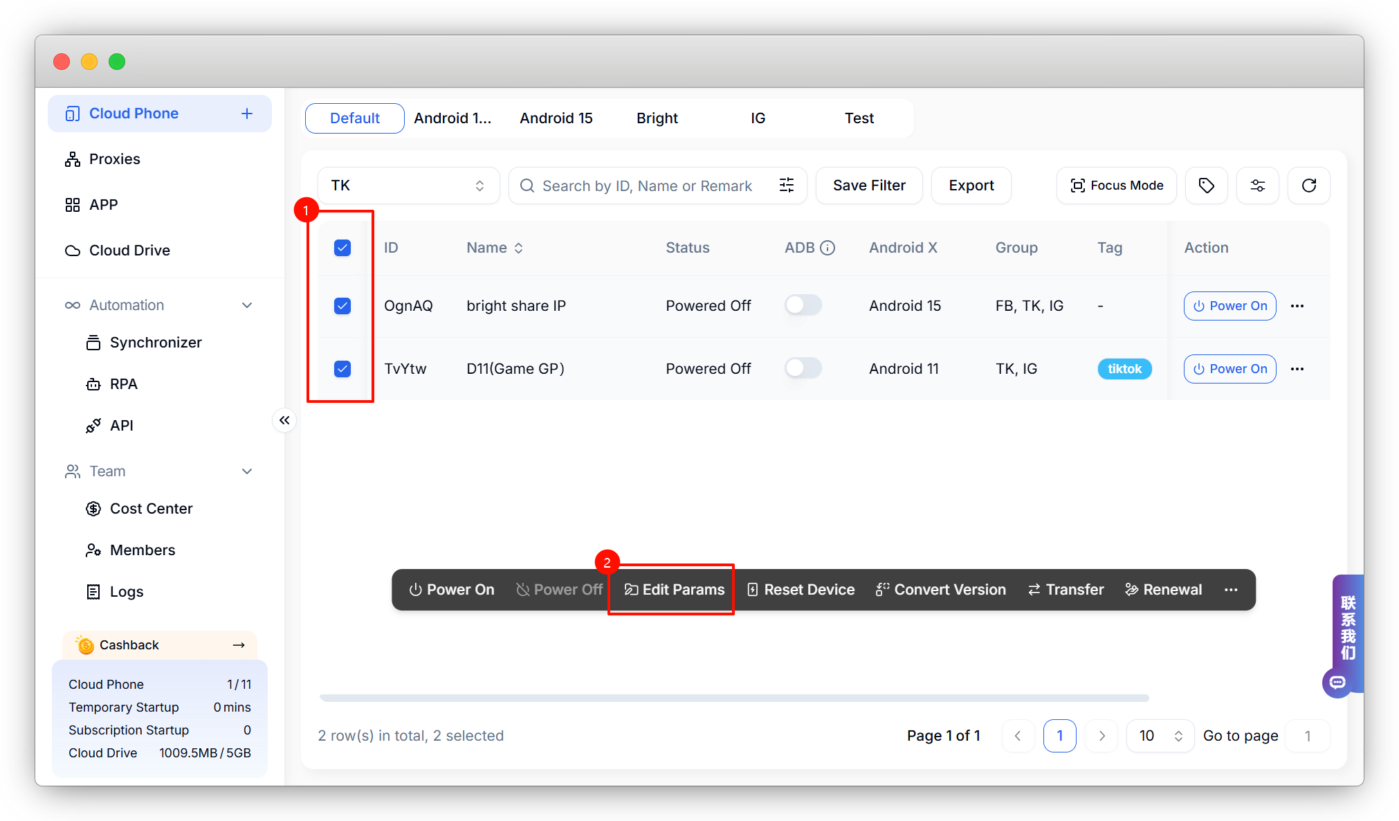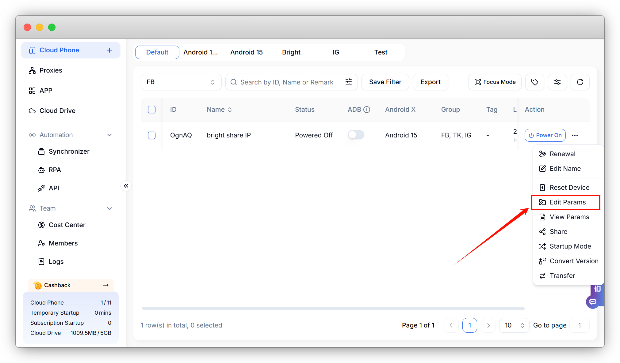 In the cloud mobile phone management menu, click on "..." and then click "Edit Params".