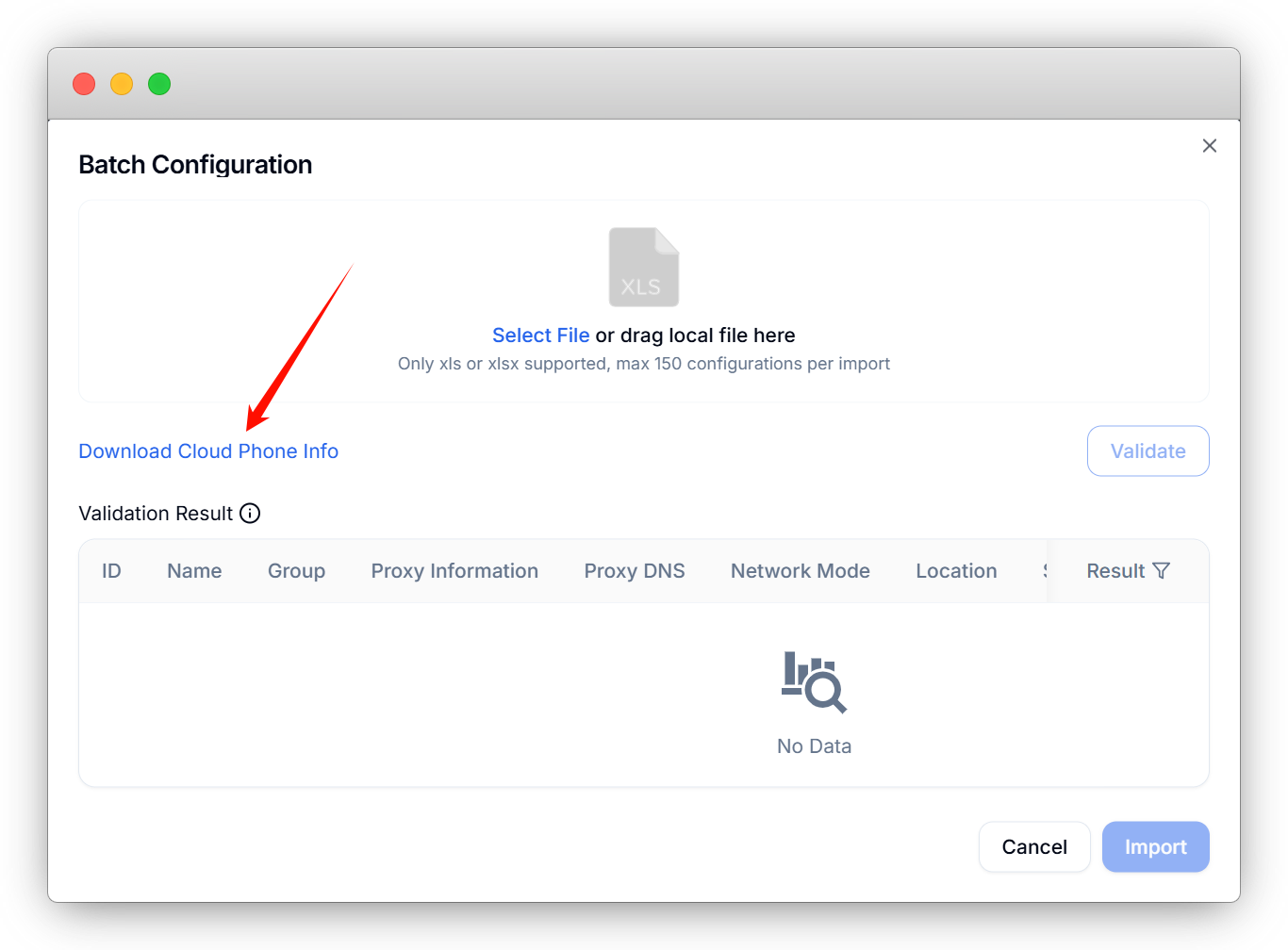 (1) Click on "Batch Configuration" to download the corresponding cloud phone information template.