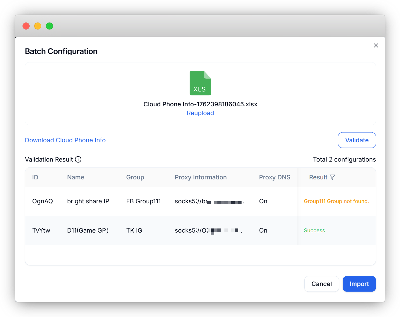 (3) Return to the cloud phone configuration page and import the saved file. The system will automatically validate the information.