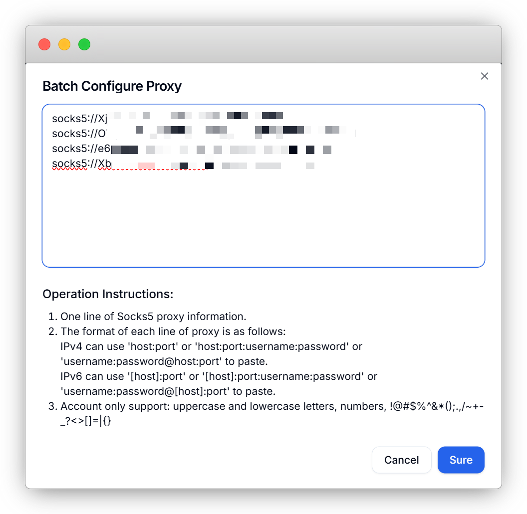 (1) Fill in multiple proxy information entries in the box according to the format, and after filling in, click "OK."
