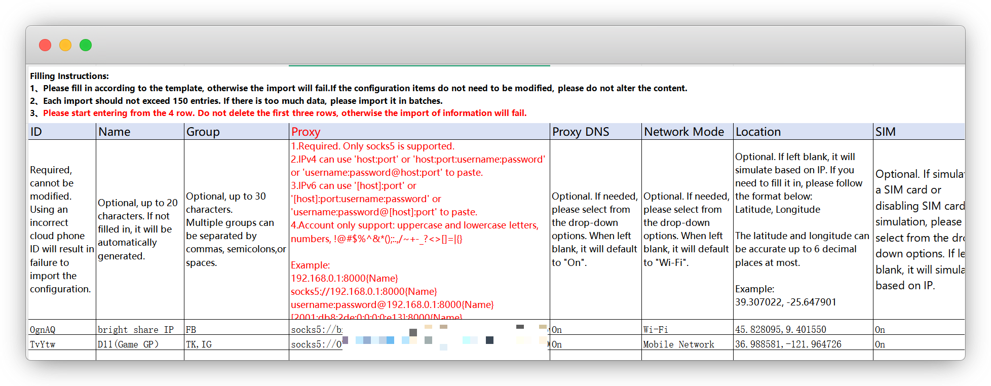 If you want to quickly batch modify the grouping, network, and simulation settings of cloud phones, you can click on the import file at position ① to modify the parameters. The specific steps are as follows: